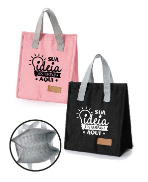 Bolsa térmica oxford com capacidade de 8 litros com fechamento em velcro. Contém alças de mãos e plaquinha personalizável fixa.